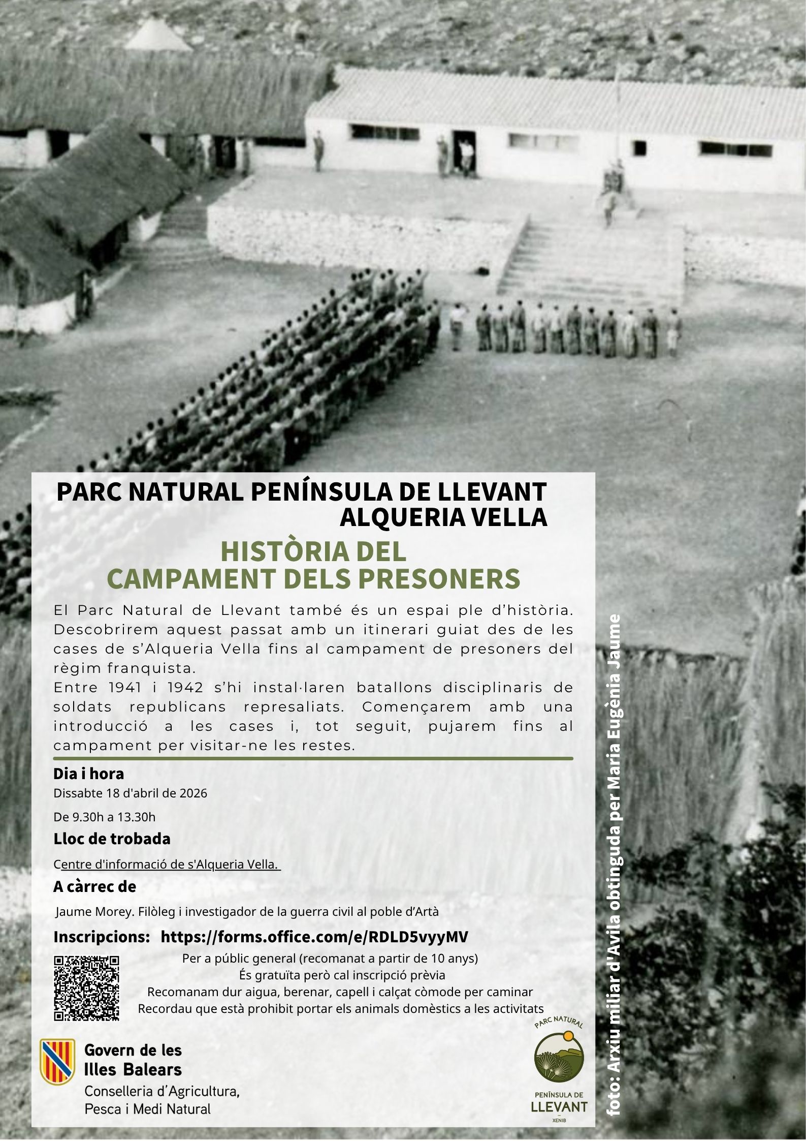 DESCRIPCIÓ: El Parc Natural de Llevant també és un espai ple d’història.Descobrirem aquest passat amb un itinerari guiat des de lescases de s’Alqueria Vella fins al campament de presoners delrègim franquista.Entre 1941 i 1942 s’hi instal·laren batallons disciplinaris desoldats republicans represaliats. Començarem amb unaintroducció a les cases i, tot seguit, pujarem fins alcampament per visitar-ne les restes.