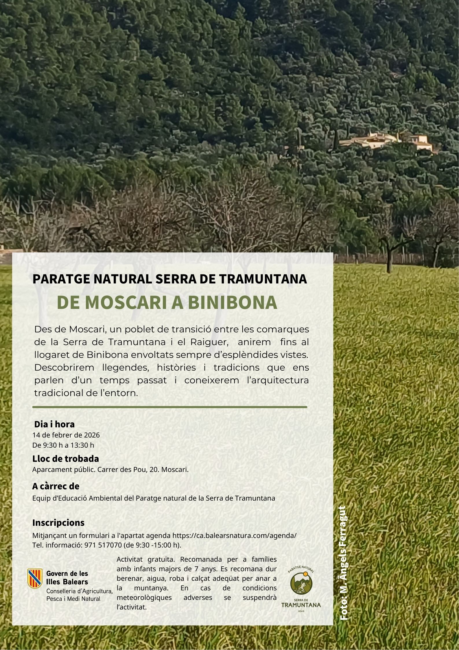 DESCRIPCIÓN: Desde Moscari, un pueblecito de transición entre las comarcas de la Serra de Tramuntana y el Raiguer, iremos hasta la aldea de Binibona rodeados siempre de espléndidas vistas. Descubriremos leyendas, historias y tradiciones que nos hablan de un tiempo pasado y conocereremos la arquitectura tradicional del entorno.