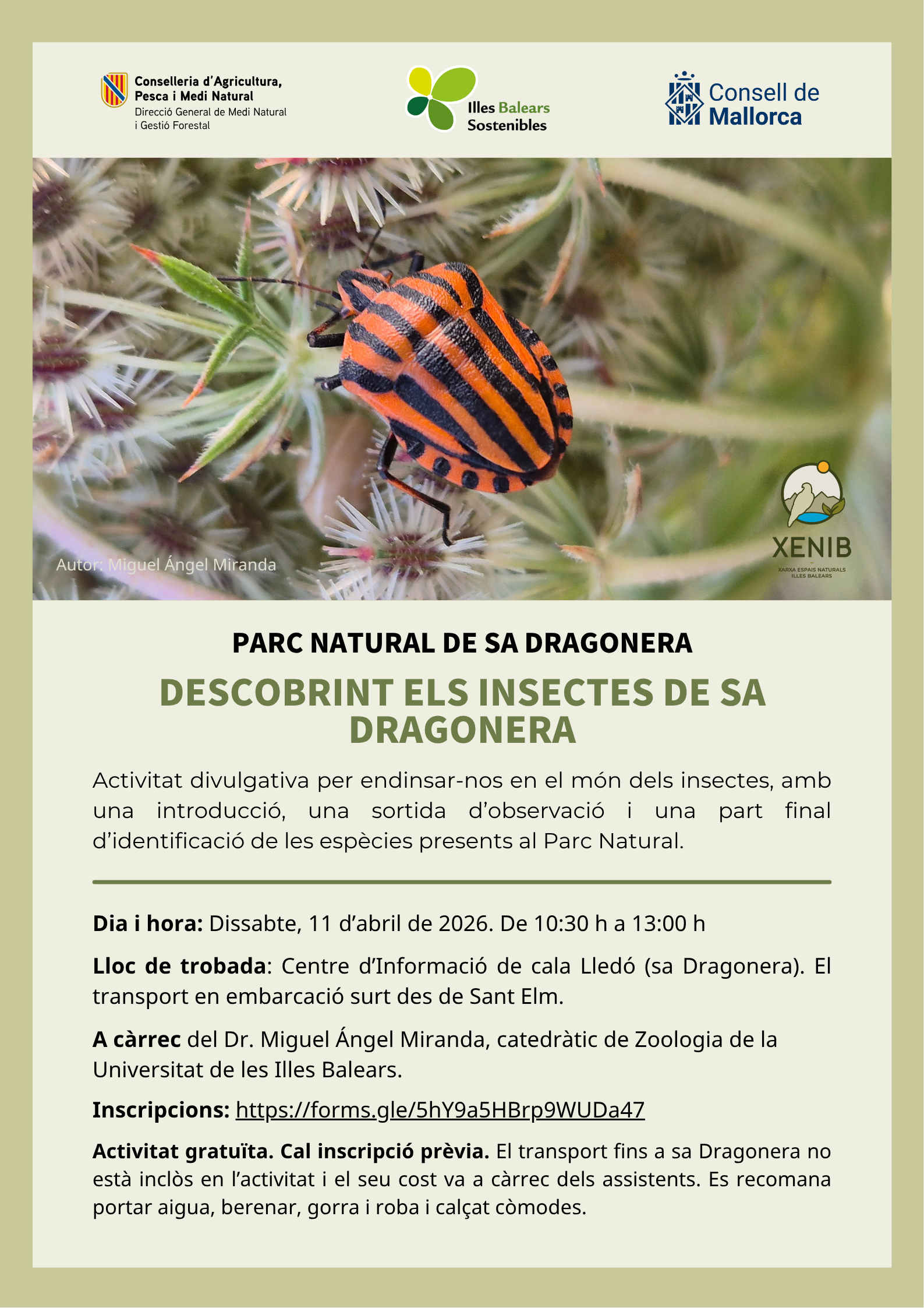 DESCRIPCIÓN: Actividad divulgativa para adentrarnos en el mundo de los insectos, con una introducción, una salida de observación y una parte final de identificación de las especies presentes en el Parque natural de sa Dragonera .