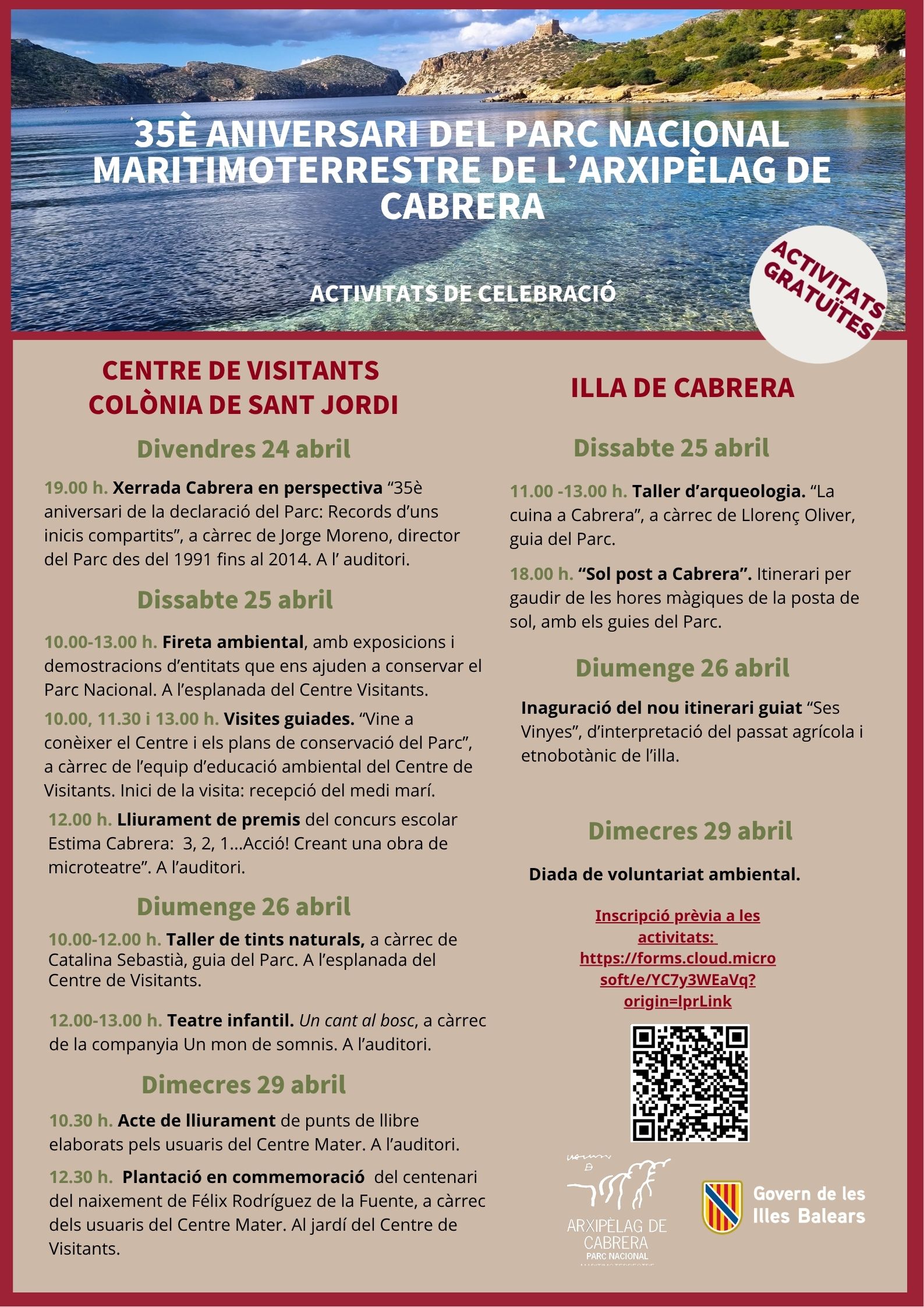 AVISO IMPORTANTE: Para inscribiros hay que rellenar este formulario. Si tenéis qualque duda podéis contactar por correo electrónico a centredevisitantsdecabrera@gmail.com, o al teléfono 971 17 61 24. Horario atención al público: de 10:00h a 17:00h. Recibiréis un correo para confirmar la inscripción.