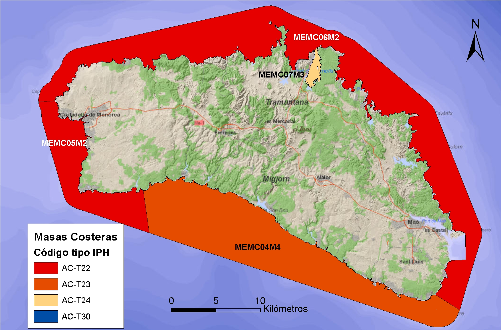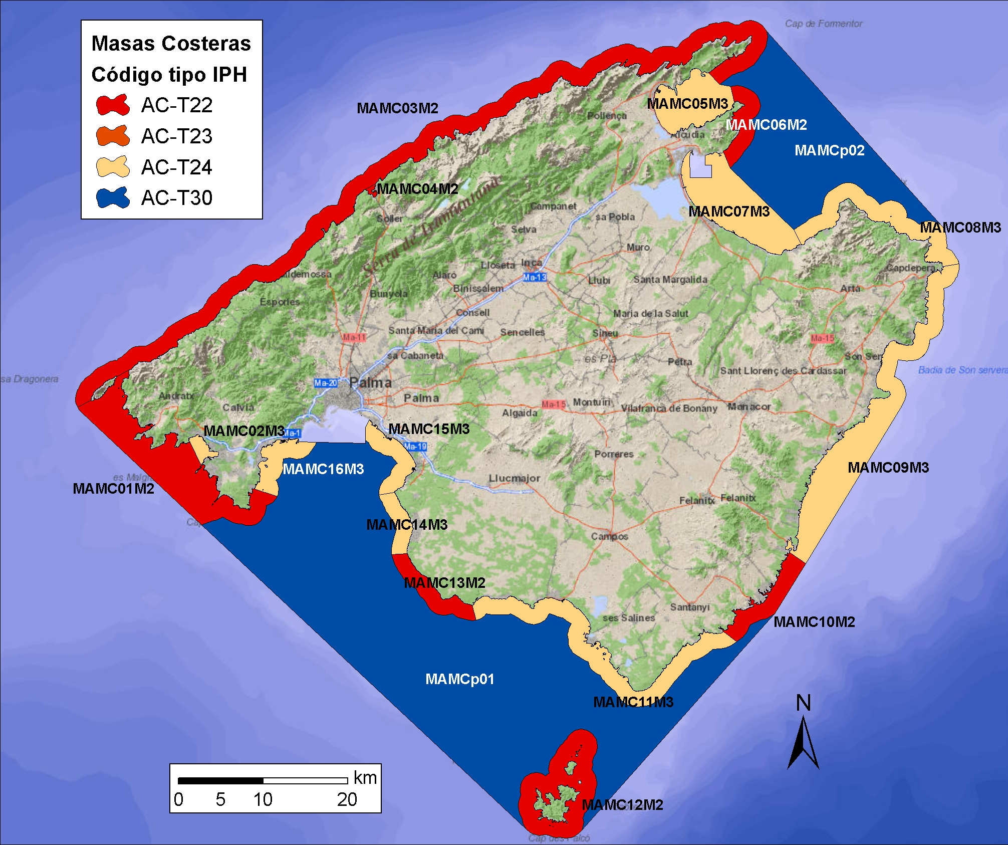Atendiendo estos criterios, en las Illes Balears se diferencian 36 masas de aguas costeras naturales: 18 en Mallorca, 4 en Menorca y 14 en Eivissa y Formentera. Estas se pueden clasificar en cuatro tipos según la planificación hidrológica balear, en función del sustrato y la profundidad: