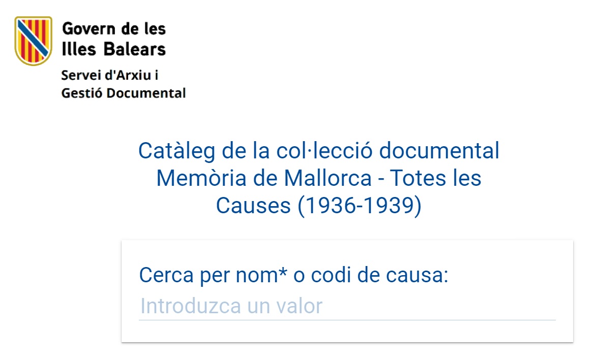 En cuanto al funcionamiento del catálogo, es importante escribir los nombres en minúsculas y pulsar ENTER para iniciar la búsqueda. Si el nombre aparece con el número de causa o causas, podréis iniciar el proceso de solicitud de acceso. En caso de que el nombre aparezca sin código, podéis dirigiros al Archivo del Juzgado Togado Militar Territorial n.º 33 de Palma (CP 07002, C/ de Jaume Lluís Garau, 1, Cuartel General Palacios - Q_Ingenieros – Q_Avenidas) para realizar su consulta presencial.