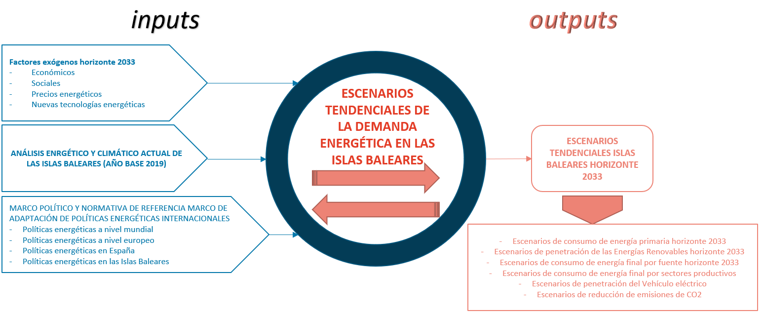 En el escenario tendencial se aprecia una disminución de las emisiones totales. El mayor causante de esta disminución es la nueva interconexión con la península prevista para el 2026-2027. La energía importada de la península aumentará, disminuyendo el uso de combustibles para generación eléctrica de alto factor de emisión en Islas Baleares. Además, esta energía importada, por el hecho que el mix de generación peninsular tiene un factor de emisión muy inferior al de la generación eléctrica en Islas Baleares, aportará menos emisiones. La mejora de la eficiencia energética y una mayor presencia de renovables también favorecen esta disminución. Sin embargo, la reducción de emisiones en este escenario no es suficiente para conseguir el objetivo de la Ley 10/2019. Respecto a 1990, las emisiones se prevén un 3% superiores.