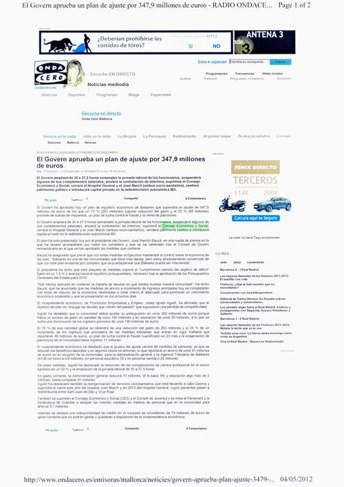 El govern ampliará de 35 a 37,5 horas semanales la jornada laboral de los funcionarios, suspenderá algunos de sus complementos salariales, anulará la contratación de interinos, suprimirá el Consejo Económico y Social, cerrará el Hospital General y el Joan March (ambos socio-sanitarios), venderá patrimonio público e introducirá capital privado en la radiotelevisión autonómica IB3
