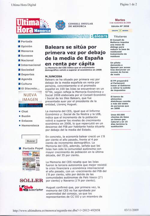 Ultima Hora Menorca. Edición digital -- Viernes 30 de octubre de 2009
