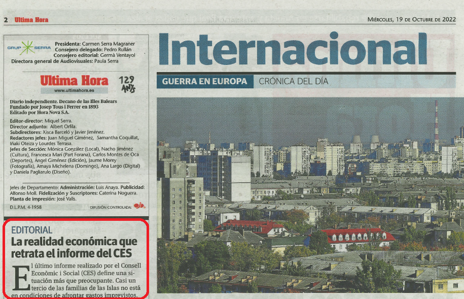 El editorial hace mención a la Memoria del CES sobre la economía, el trabajo y la sociedad de las Islas Baleares