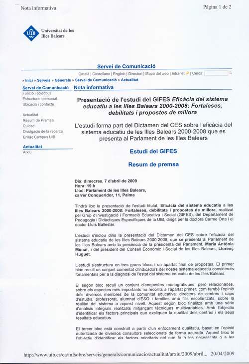 Presentació de l'estudi del GIFES Eficàcia del sistema educatiu de les Illes Balears 2000-2008: fortaleses, debilitats i propostes de millora