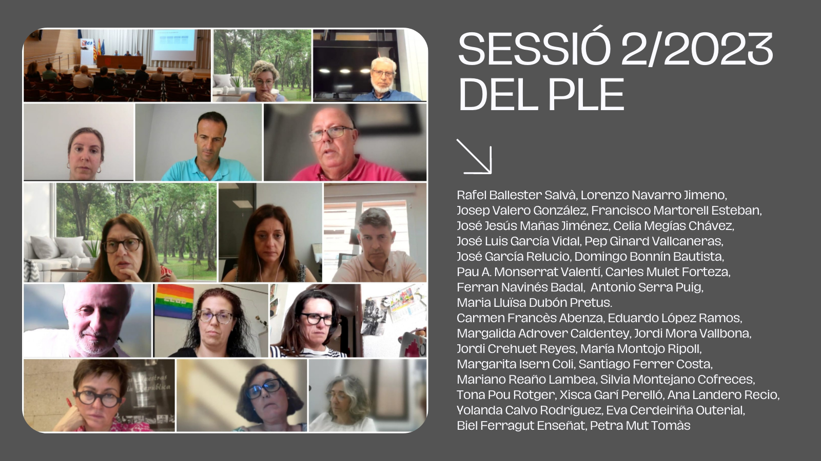 Sesión 2/2023 del Pleno. Presidida por Rafel Ballester Salvà; asistida por el vicepresidente primero, Lorenzo Navarro Jimeno, y el secretario general del CES, Josep Valero González.