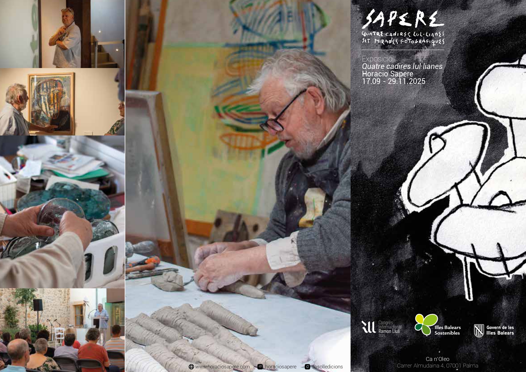 L’exposició s’inaugurà el 17 de setembre a Ca n’Oleo i es va poder visitar fins al 29 de novembre. L’activitat comptà amb el finançament de l’Impost de Turisme Sostenible (ITS). La Direcció General de Cultura de la Conselleria de Turisme, Cultura i Esports presenta l’exposició “Quatre cadires lul·lianes” de l’artista Horacio Sapere, que s’inaugurà dia 17 de setembre al pati de Ca n’Oleo. En aquesta exposició, Sapere s’inspira en la filosofia de Ramon Llull i en l’ús dels símbols i les formes geomètriques que el pensador mallorquí considerava essencials per comprendre l’Univers i les relacions entre el diví i l’humà. L’artista utilitza materials com el vidre, el metall i el fang, inspirant-se en els cinc elements —fusta, foc, terra, metall i aigua— que, combinats, estimulen els sentits de la vista i el tacte. L’exposició compta també amb l’edició del catàleg “Quatre mirades lul·lianes. Set mirades fotogràfiques”, amb textos d’Aránzazu Miró, Marisa Aldeguer i Ricarda Margarita Vicens, i fotografies de Javier Garcia, Leo Sapere, Leticia Muñoz, Natalia Lebedeva, Óscar Pipkin, Pepe Cañabate i Pere Colom. Dins el projecte es programaren les conferències:
