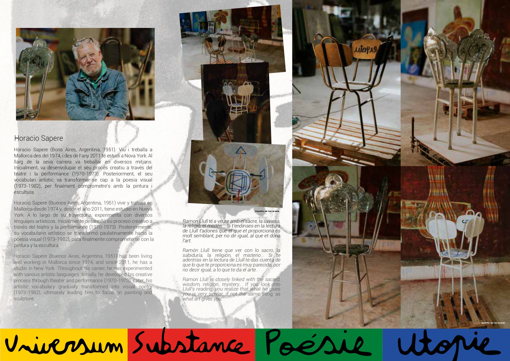 L’exposició s’inaugurà el 17 de setembre a Ca n’Oleo i es va poder visitar fins al 29 de novembre. L’activitat comptà amb el finançament de l’Impost de Turisme Sostenible (ITS). La Direcció General de Cultura de la Conselleria de Turisme, Cultura i Esports presenta l’exposició “Quatre cadires lul·lianes” de l’artista Horacio Sapere, que s’inaugurà dia 17 de setembre al pati de Ca n’Oleo. En aquesta exposició, Sapere s’inspira en la filosofia de Ramon Llull i en l’ús dels símbols i les formes geomètriques que el pensador mallorquí considerava essencials per comprendre l’Univers i les relacions entre el diví i l’humà. L’artista utilitza materials com el vidre, el metall i el fang, inspirant-se en els cinc elements —fusta, foc, terra, metall i aigua— que, combinats, estimulen els sentits de la vista i el tacte. L’exposició compta també amb l’edició del catàleg “Quatre mirades lul·lianes. Set mirades fotogràfiques”, amb textos d’Aránzazu Miró, Marisa Aldeguer i Ricarda Margarita Vicens, i fotografies de Javier Garcia, Leo Sapere, Leticia Muñoz, Natalia Lebedeva, Óscar Pipkin, Pepe Cañabate i Pere Colom. Dins el projecte es programaren les conferències: