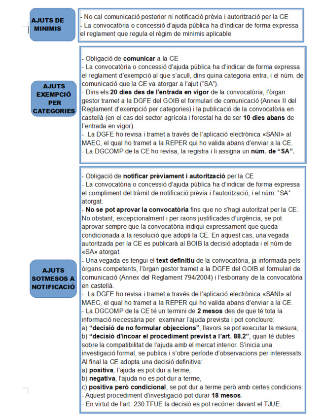 A nivell autonòmic, es va publicar la Instrucció 1/2021, del Conseller de Fons Europeus, Universitat i Cultura i de la Consellera d'Hisenda i Relacions Exteriors, de 20 de desembre del 2021, pel qual es regula el procediment de notificació i comunicació a la Comissió Europea dels projectes que estableixin, concedeixin o modifiquin ajudes públiques.