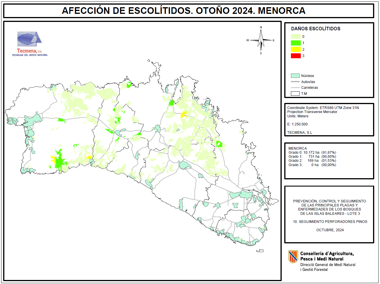 Mapa de afectación perforadores pino. Menorca. Otoño 2024