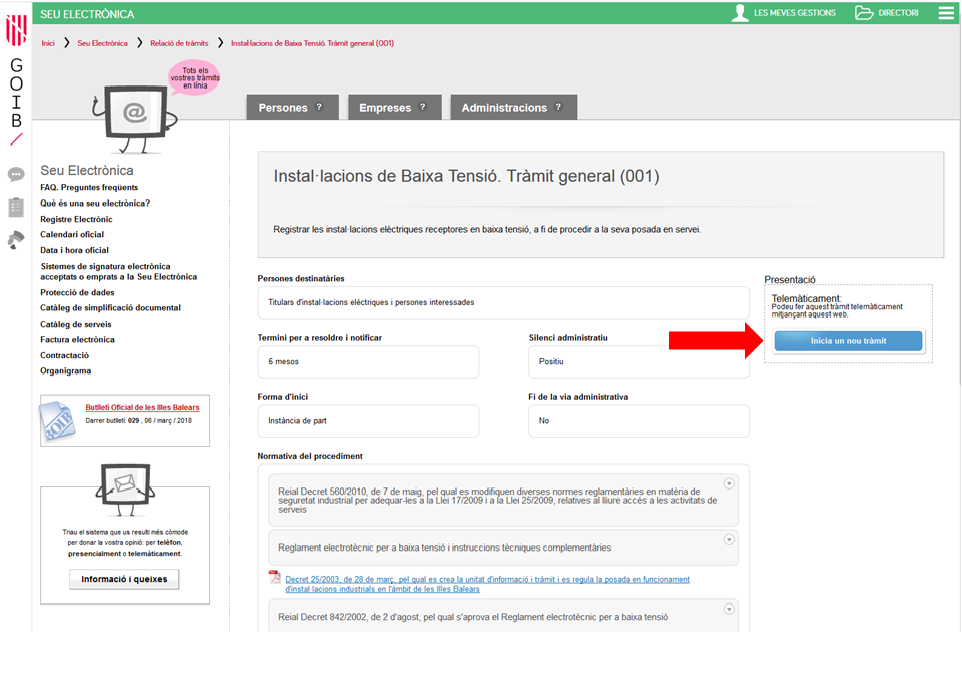 1. Acceder al Portal de tramitación telemática: Desde la web (http://industria.caib.es) acceder al portal de tramitación telemática de la UDIT, al apartado Accesos directos de la web de la Dirección General de Política Industrial. Una vez se ha accedido, se debe entrar al apartado Comenzar a tramitar.