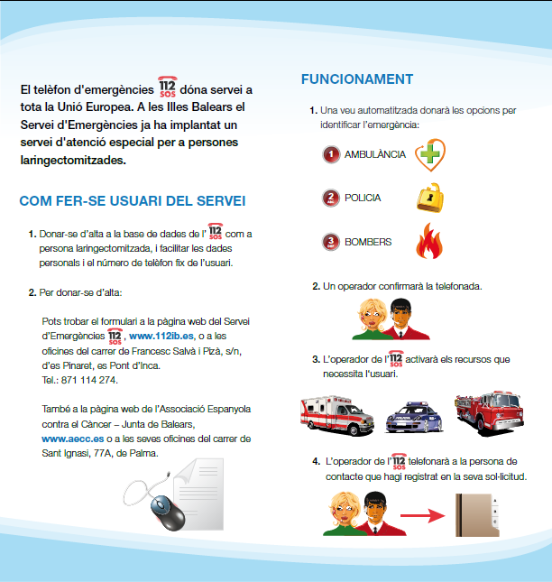 Donar-se d’alta a la base de dades de l’112 com a persona laringectomitzada, i facilitar les dades personals i el número de telèfon fix de l’usuari.