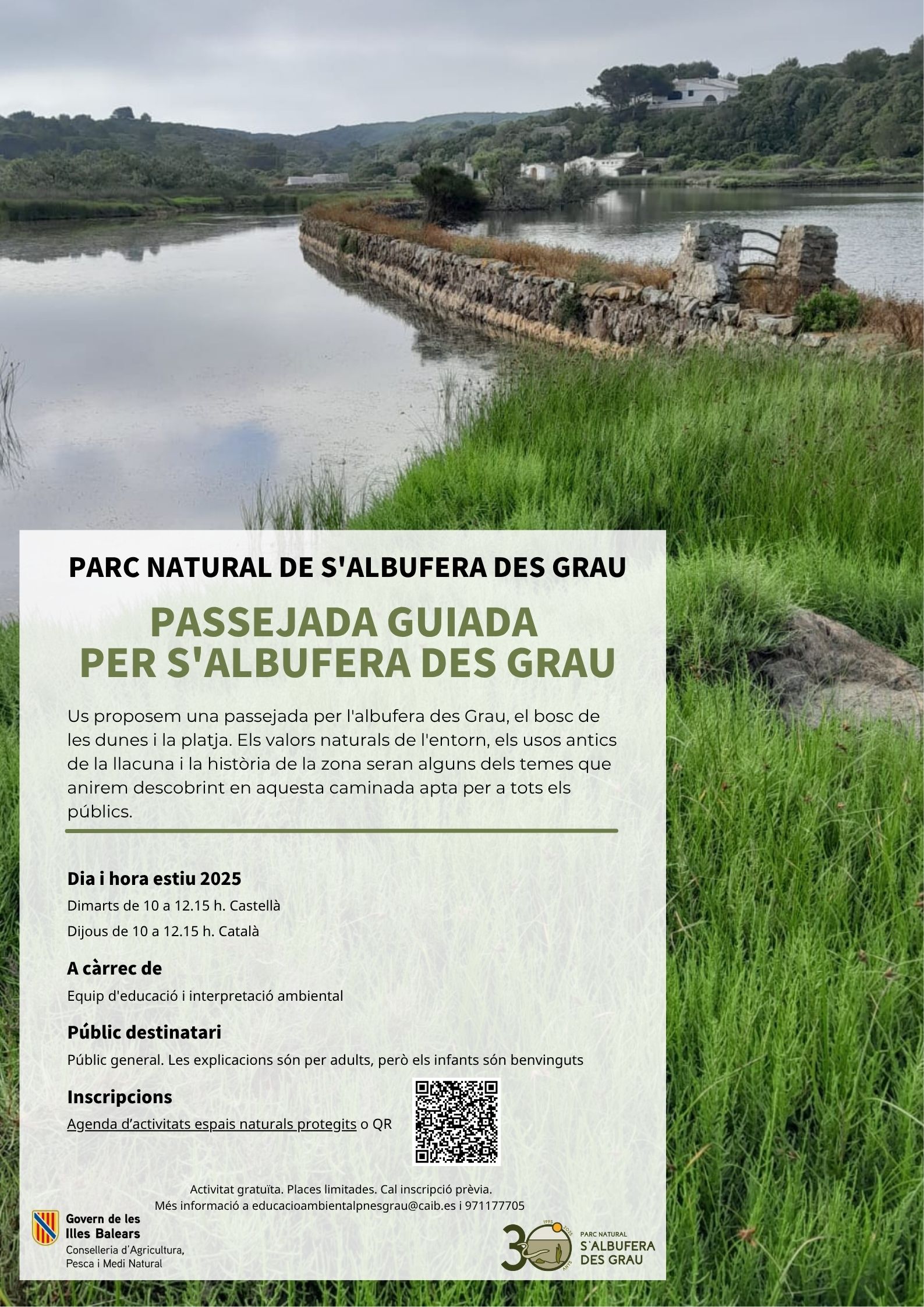 DESCRIPCIÓ: Us proposem una passejada per l'albufera des Grau, el bosc de les dunes i la platja. Els valors naturals de l'entorn, els usos antics de la llacuna i la història de la zona seran alguns dels temes que anirem descobrint en aquesta caminada apta per a tots els públics. Els dimarts en castellà i els dijous en català.
