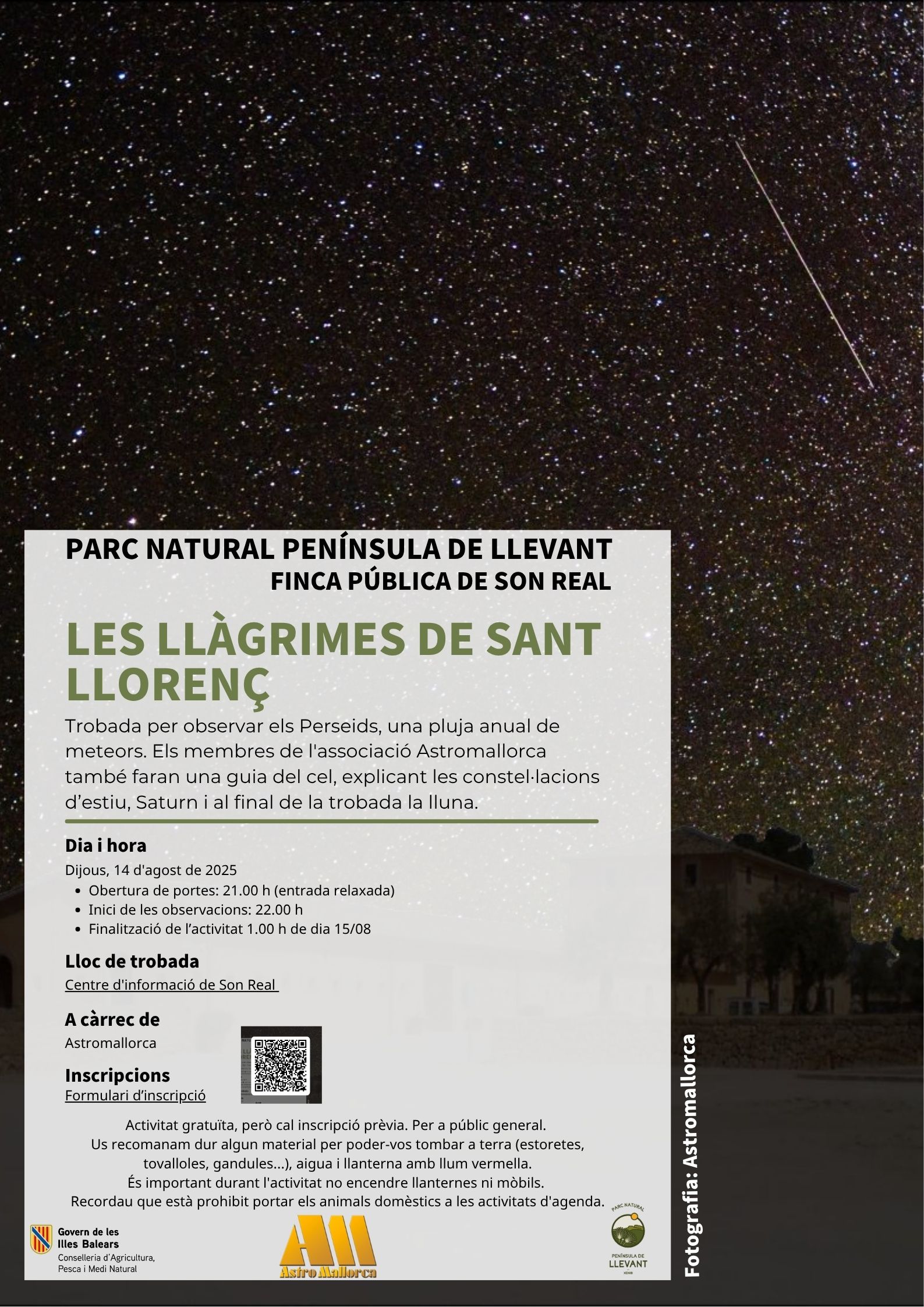 OBSERVACIONS: Activitat gratuïta, però cal inscripció prèvia. Per a públic general.Us recomanam dur algun material per poder-vos tombar a terra (estoretes,tovalloles, gandules...), aigua i llanterna amb llum vermella.És important durant l'activitat no encendre llanternes ni mòbils.Recordau que està prohibit portar els animals domèstics a les activitats d'agenda.
