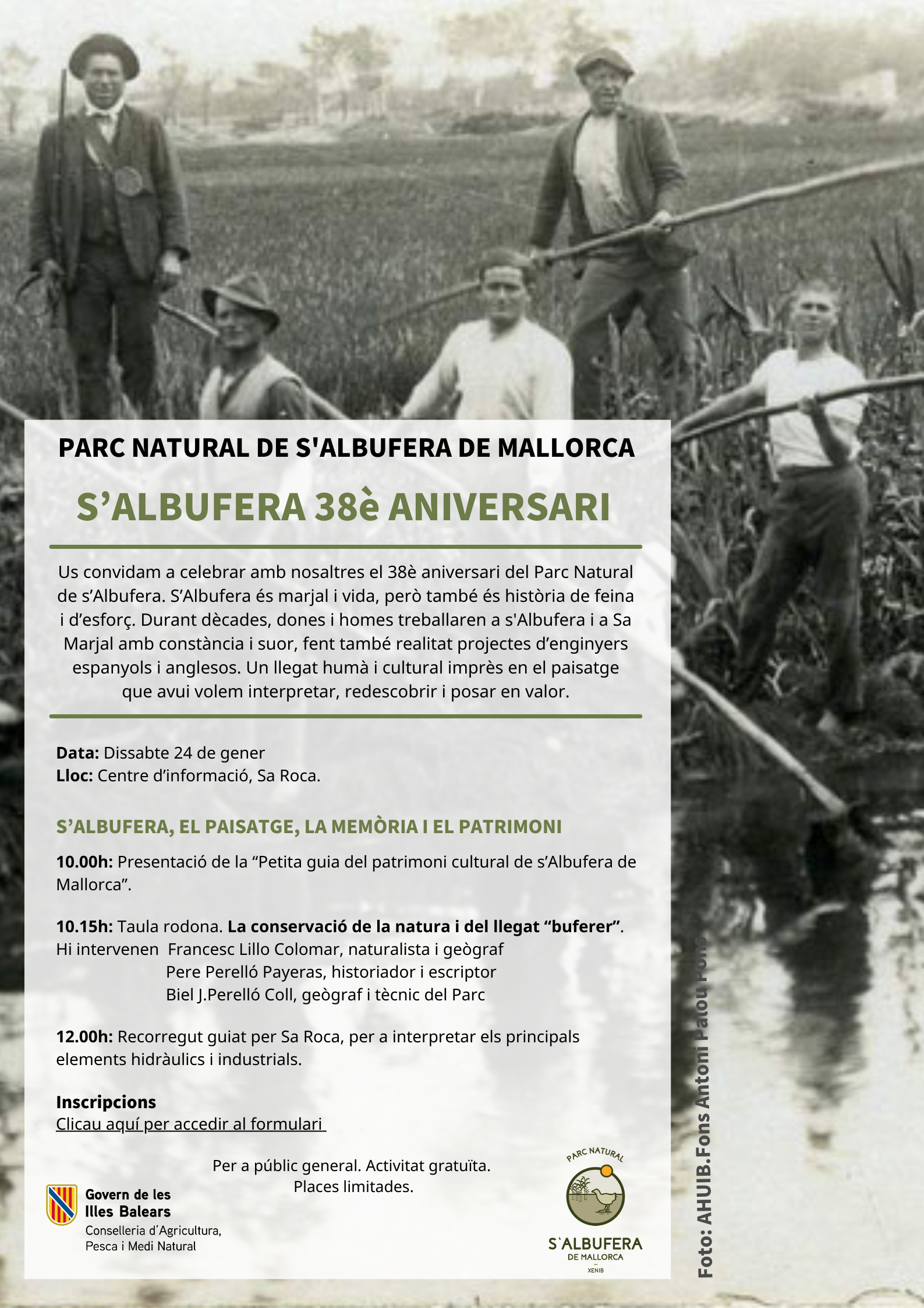 Us convidam a celebrar amb nosaltres el 38è aniversari del Parc Natural de s’Albufera. S’Albufera és marjal i vida, però també és història de feina i d’esforç. Durant dècades, dones i homes treballaren a s'Albufera i a Sa Marjal amb constància i suor, fent també realitat projectes d’enginyers anglesos a partir de la feina prèvia de cartògrafs i enginyers civils i militars mallorquins. Un llegat humà i cultural imprès en el paisatge que avui volem interpretar, redescobrir i posar en valor.