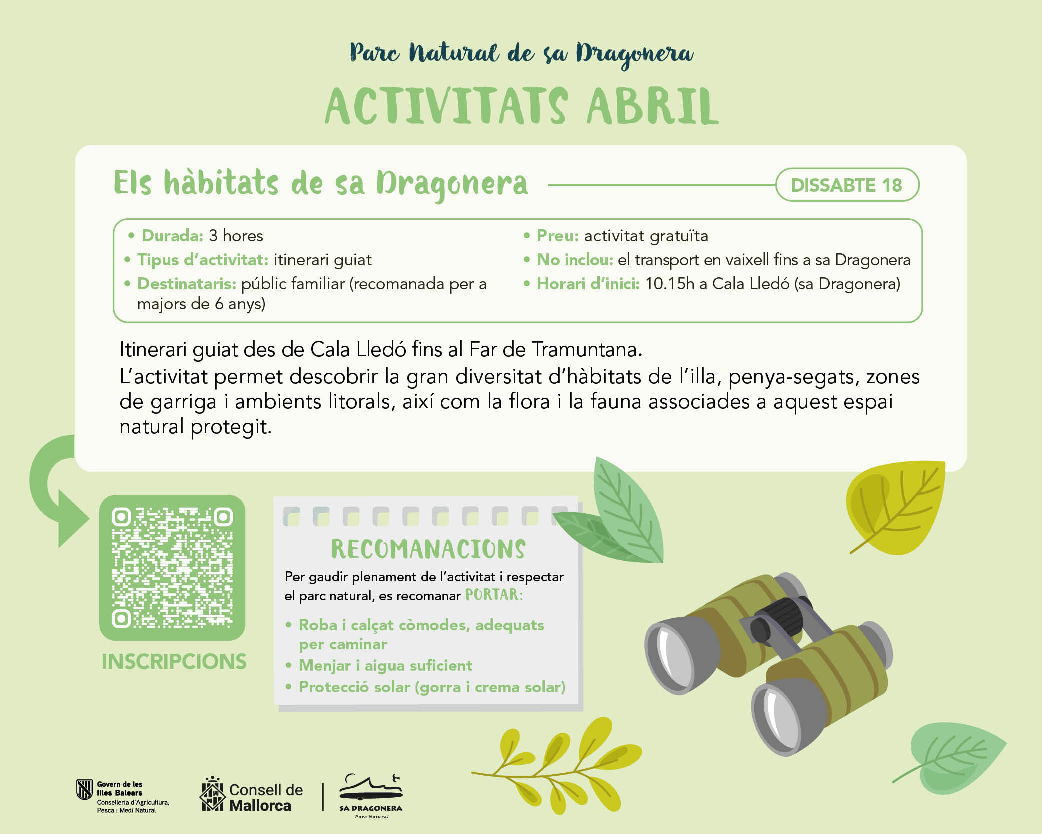 DESCRIPCIÓ: Itinerari guiat des de cala Lledó fins al far de Tramuntana per conèixer els diferents hàbitats que es poden veure a l'illa de sa Dragonera. Des d'ambients agraris, a penya-segats, garrigues, cales o ambient de muntanya. Observarem el vol dels ocells i gaudirem de la flora de primavera.