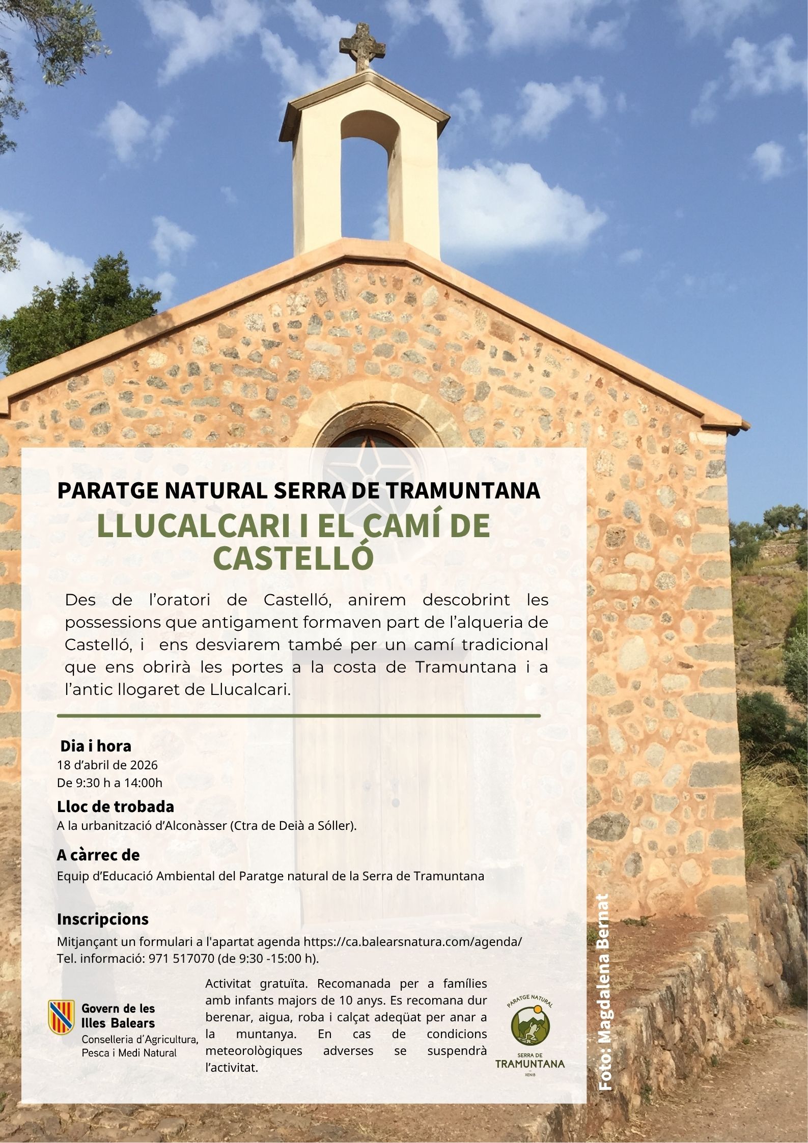 DESCRIPCIÓ: Des de l'oratori de Castelló, anirem descobrint les possessions que antigament formaven part de l'alqueria de Castelló, i ens desviarem també per un camí tradicional que ens obrirà les portes a la costa de Tramuntana i a l'antic llogaret de Llucalcari.