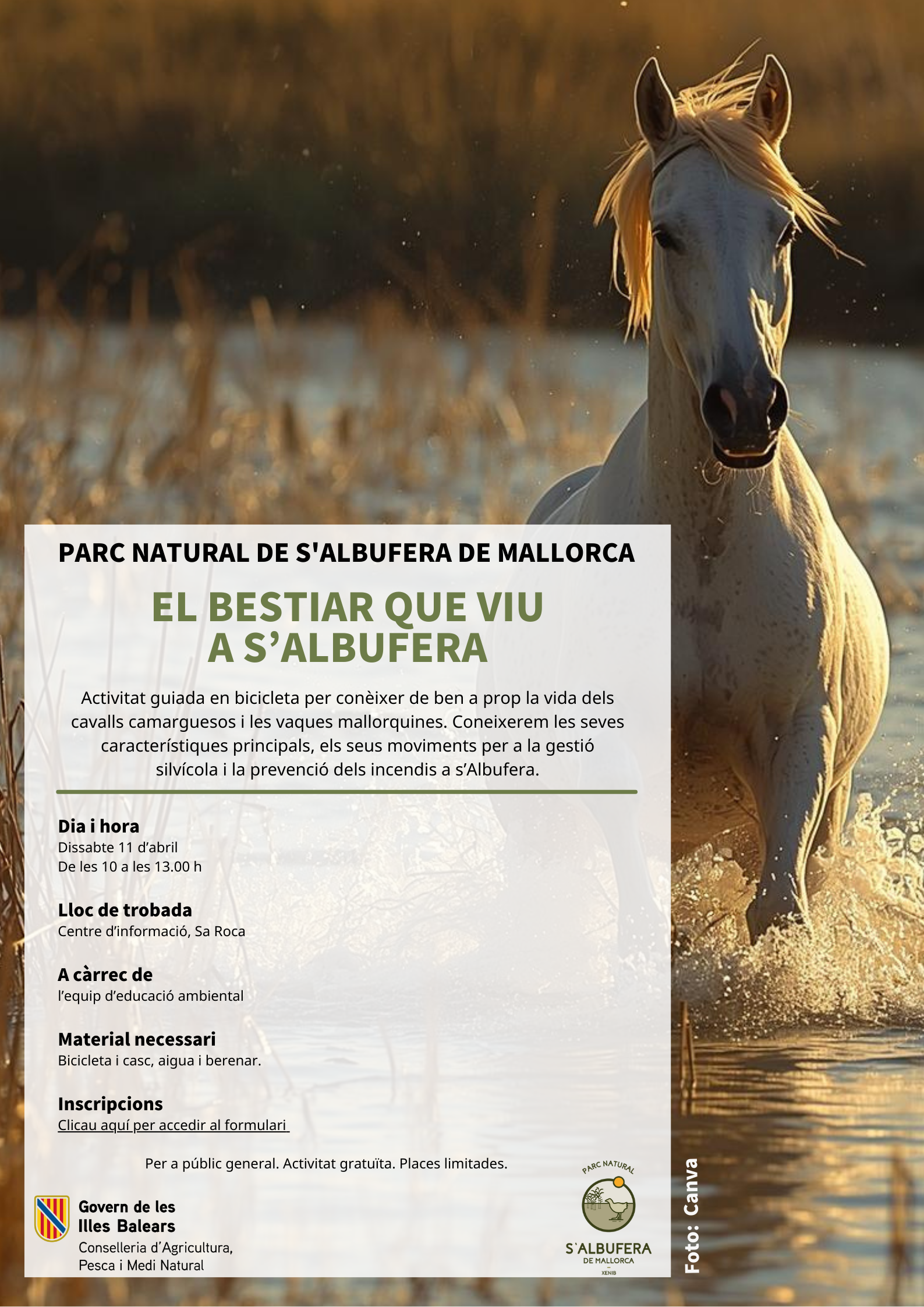 Actividad guiada en bicicleta para conocer de cerca la vida de los caballos camargueses y las vacas mallorquinas. Conoceremos sus características principales, sus movimientos para la gestión silvícola y la prevención de los incendios en s'Albufera.