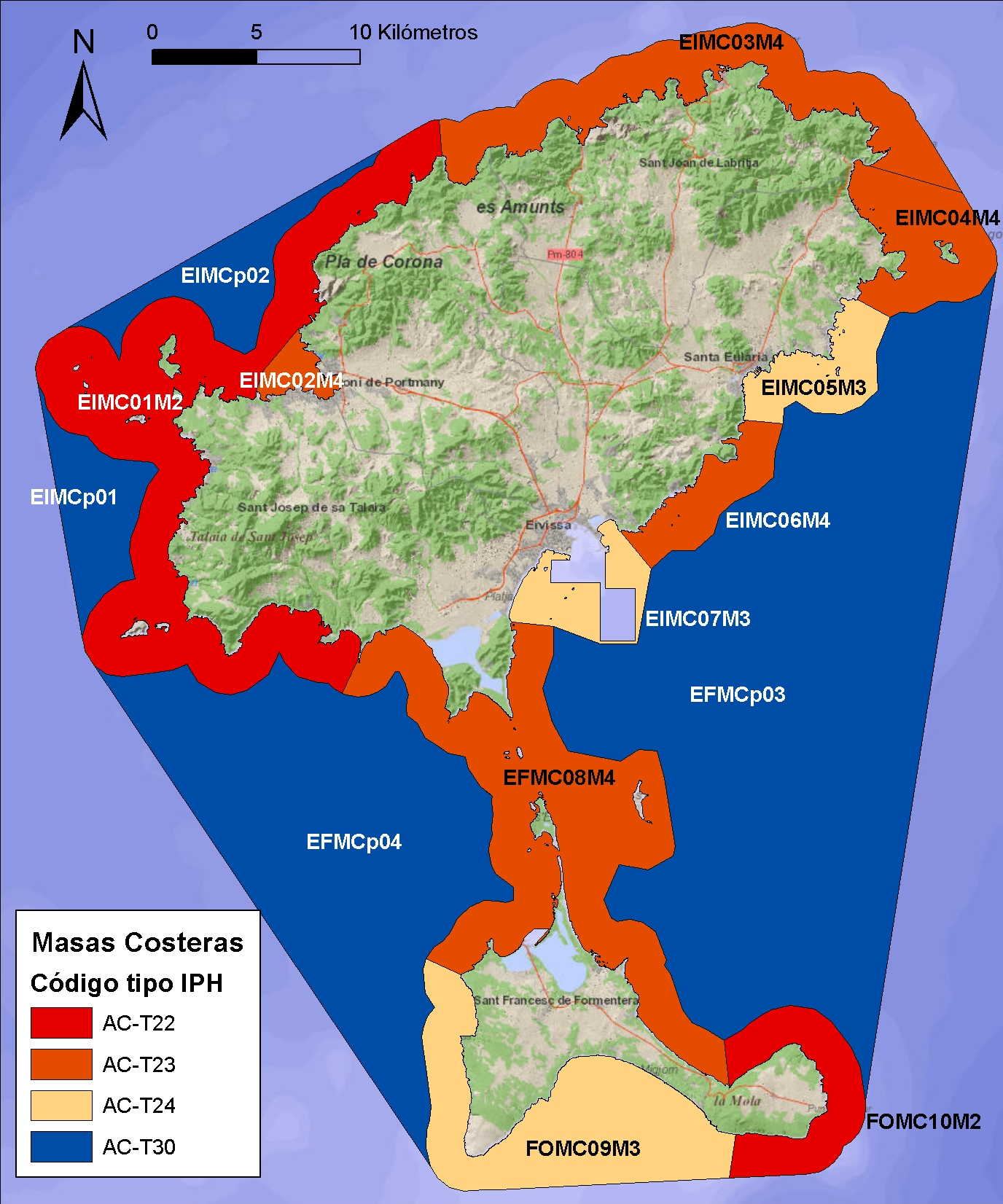 A més d’aquestes 36 masses, s’han de sumar les 5 masses d’aigua molt modificades per la presència de ports (Port de Palma, Port d’Alcúdia, Port de Maó, Port d’Eivissa, Port de la Savina), arribant així a un total de 41 masses d’aigua costanera.
