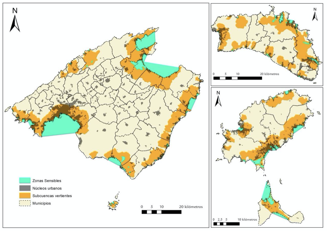 A les Illes Balears, mitjançant el Decret 49/2003, de 9 de maig, es varen declarar les zones sensibles, normals i menys sensibles en les aigües del litoral. A aquestes zones els abocaments procedents de plantes de tractament d’aigües residuals urbanes han de donar compliment a requisits addicionals als convencionals, per tal de minimitzar el risc d’eutrofització. Aquestes zones es designen atenent a criteris d’eutrofització actual o potencial, capacitat d’absorció del medi i usos posteriors de les aigües.