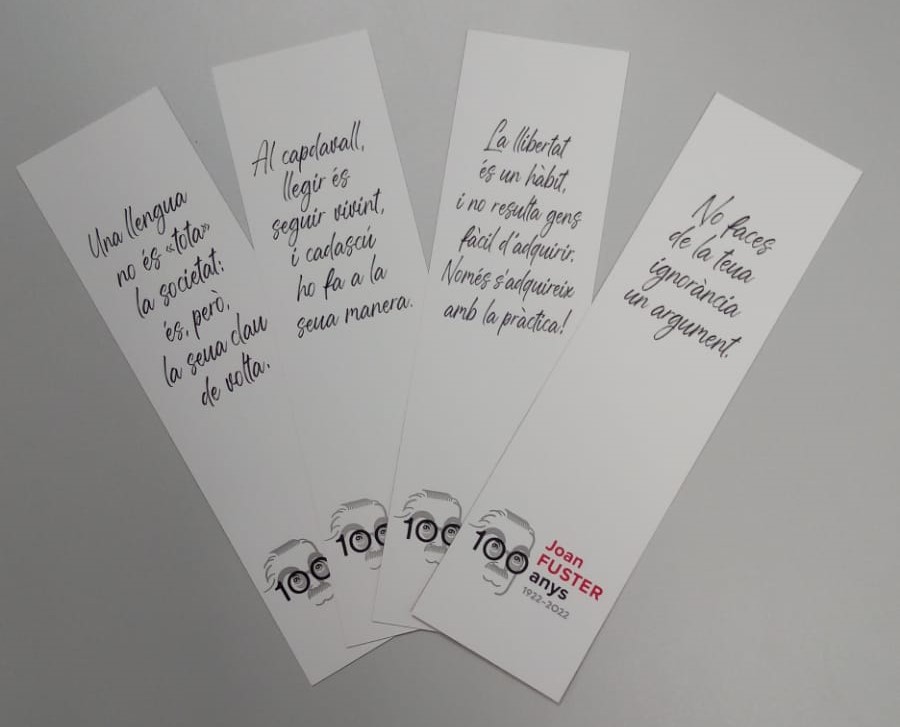 Hi ha quatre models de punts de llibre, cadascun dels quals conté un aforisme de Joan Fuster.