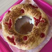 En primer lloc, preescalfam el forn a 180 ºC. Mentre s’escalfa, posam les masses de pasta fullada a dues planxes de forn. A ambdues els feim el forat del mig que té el tortell, i únicament a una li posem les guindes i la pintam amb l’ou pasteuritzat. També es pot utilitzar ametlla laminada per decorar, però al Centre de Dia tenim usuaris al·lèrgics als fruits secs i no en feim ús.