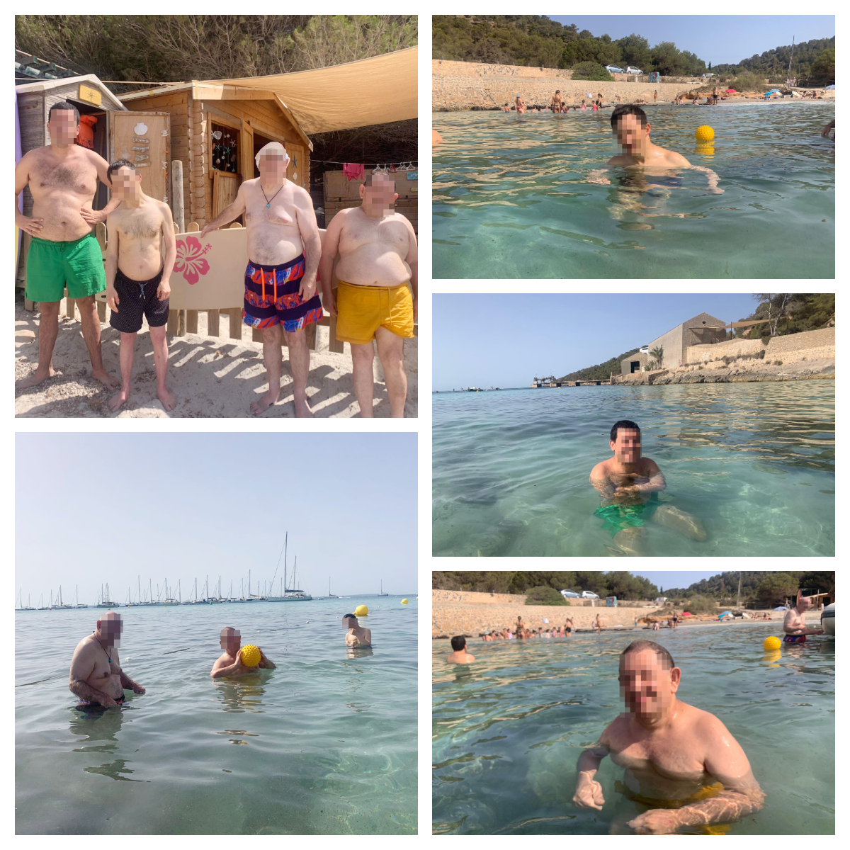Durante los meses de verano un grupo de personas usuarias de la Residencia Can Raspalls acuden semanalmente a la playa de Las Salinas para bañarse en el mar, jugar con la pelota y pasear por la playa.