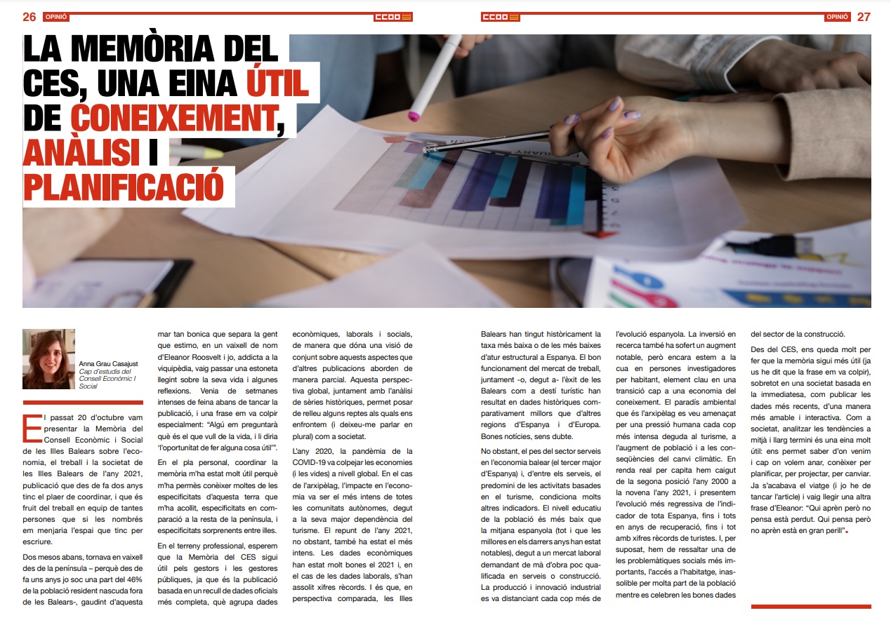 Article de la cap d'estudis del CES Illes Balears sobre la Memòria del CES sobre l'economia, el treball i la societat de les Illes Balears 2021.