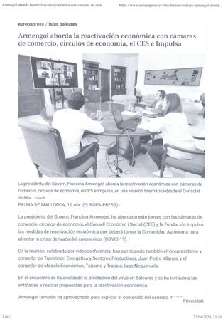 En la reunión han participado el presidente del CES, Carles Manera; el director de la Fundación Impulsa, Antoni Riera; los presidentes de los Círculos de Economía José María Vicens (Mallorca) y Francisco Tutzó (Menorca); los presidentes de las cámaras de Comercio, Antoni Mercant (Mallorca) Rubén Adrián Pastor (Menorca); el vicepresidente de la Cámara de comercio de Ibiza y Formentera, Joan Guasch, y el delegado territorial de la misma, Juan Manuel Costa.