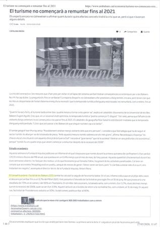 El Consell Econòmic i Social de les Balears (CES) també ha calculat la caiguda de l’economia balear. En el seu informe indica que en el pitjor dels casos el descens pot arribar fins a un 9,7% del PIB el 2020. Això passaria si l’aturada de l’activitat es prorrogàs fins al 30 de juny, fet que provocaria una davallada del 70% en el comerç i del 90% en l’hostaleria. En el millor dels escenaris, la baixada seria, com a mínim, d’un 3,7%, dues dècimes menys que en la recessió del 2008, quan va ser d’un 3,9%. Aquest seria el cas si la data de retorn a la normalitat fos, com a màxim, el 31 de maig. En aquest cas, l’activitat de l’hostaleria es reduiria un 50%, i la del comerç podria arribar al 40%.