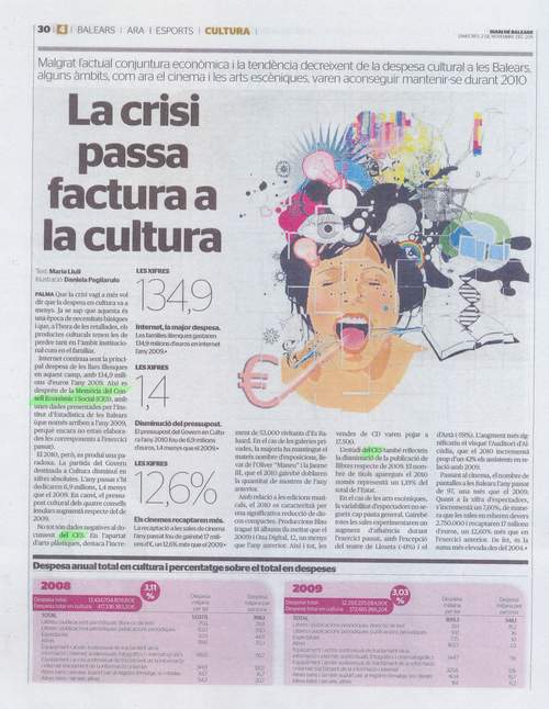 Malgrat l'actual conjuntura econòmica i la tendència decreisent de la despesa cultural a les Balears, alguns àmbits, com ara el cinema i les arts escèniques, varen aconseguir mantenir-se durant 2010