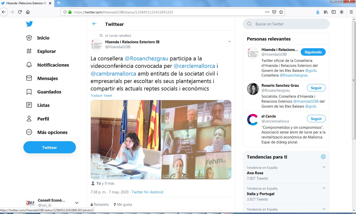 La consellera @Rosanchezgrau participa a la videoconferència convocada per @cerclemallorca i @cambramallorca amb entitats de la societat civil i empresarials per escoltar els seus plantejaments i compartir els actuals reptes socials i econòmics