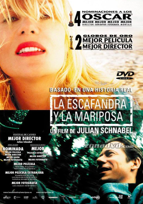 | "L’escafandre i la papallona". 112 minuts L'escafandre i la papallona explica la vertadera història de Jean-Dominique Bauby, redactor en cap de la revista Elle, que cau en un coma profund. En el seu despertar, totes les seves facultats motrius són reduïdes a no-res. Pateix la "síndrome locked-in": no pot ni parlar ni respirar sense assistència. Gràcies al moviment de l’ull esquerre pot dir sí -un cop de parpella- o no -dos cops de parpella. És amb aquesta única relació amb l'exterior que emprèn la redacció d'un llibre, lletra a lletra. | |