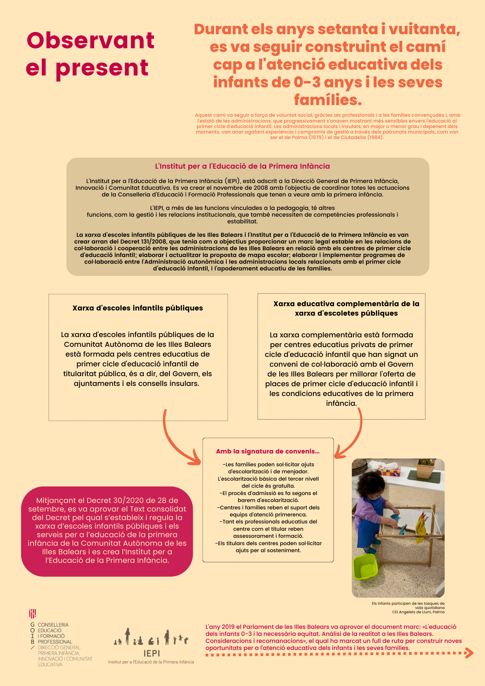 El Instituto para la Educación de la Primera Infancia (IEPI), adscrito a la Dirección General de Primera Infancia, Atención a la Diversidad y Mejora Educativa, es un órgano creado en noviembre de 2008 con el objetivo de coordinar todas las actuaciones que tienen que ver con la primera infancia de la Consellería de Educación y Universidades.