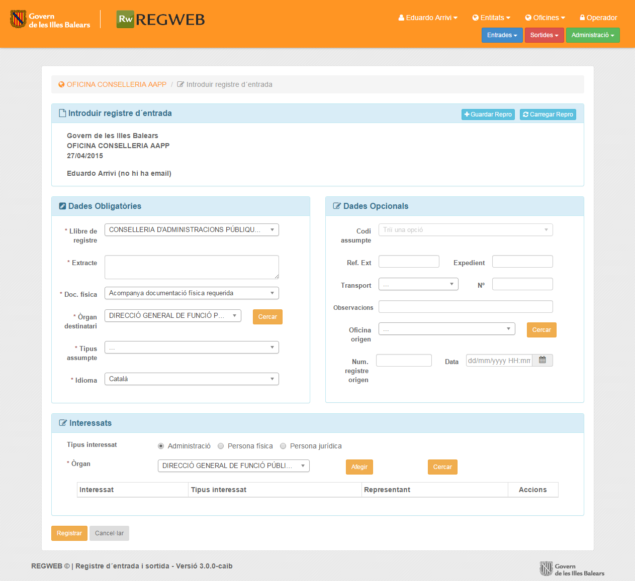 Descripció funcionalREGWEB és una aplicació per gestionar els registres presencials d'entrada i sortida d'un organisme. L'eina genera un número de registre i un segell amb les dades del registre (oficina, data i hora) que es pot imprimir sobre el document registrat. Tots els registres s'emmagatzemen en base de dades per a posteriors consultes. L'aplicació permet gestionar diferents oficines i assignar usuaris de registre a cada una d'elles. A més permet modificar registres efectuats així com generar oficis de remissió entre oficines. A partir de la versió 3.1 permet l'intercanvi d'assentaments registrals a través del Sistema d'Interconnexió de Registres (SIR). A nivell de serveis REGWEB ofereix un API de desenvolupament per a generar de forma automàtica registres d'entrada i sortida així com consulta de registres efectuats. Així mateix ofereix la possibilitat de programar accions a realitzar quan s'efectuen registres sobre determinades oficines. |