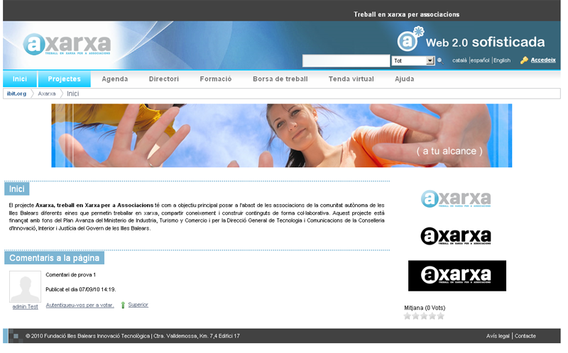 Descripción funcionalLa Web 2.0 sofisticada es un portal web de código libre basado en tecnología Liferay. Desarrollado en el marco del proyecto Axarxa, trabajo en Red para Asociaciones, se trata de una solución para organizaciones con conocimientos avanzados de la Web 2.0 que quieran adaptar su web o crear una nueva con funcionalidades propias de la Web 2.0 y que, además, necesiten una web colaborativa más sofisticada que les permita conectar con asociaciones del mismo sector o ámbito de especialización para trabajar participativamente a través de la Red.