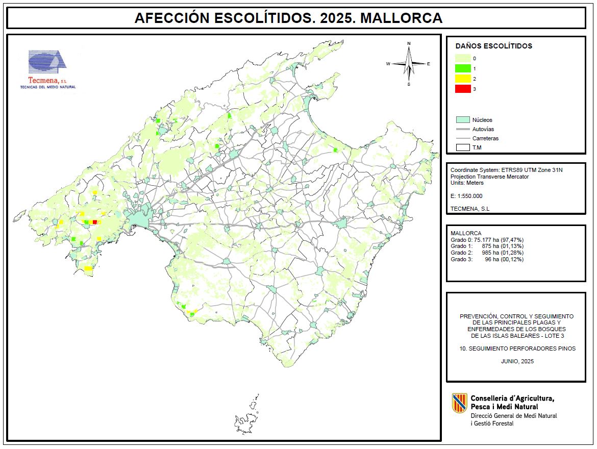 Mapa d'afectació perforadors pi. Mallorca. Primavera 2025