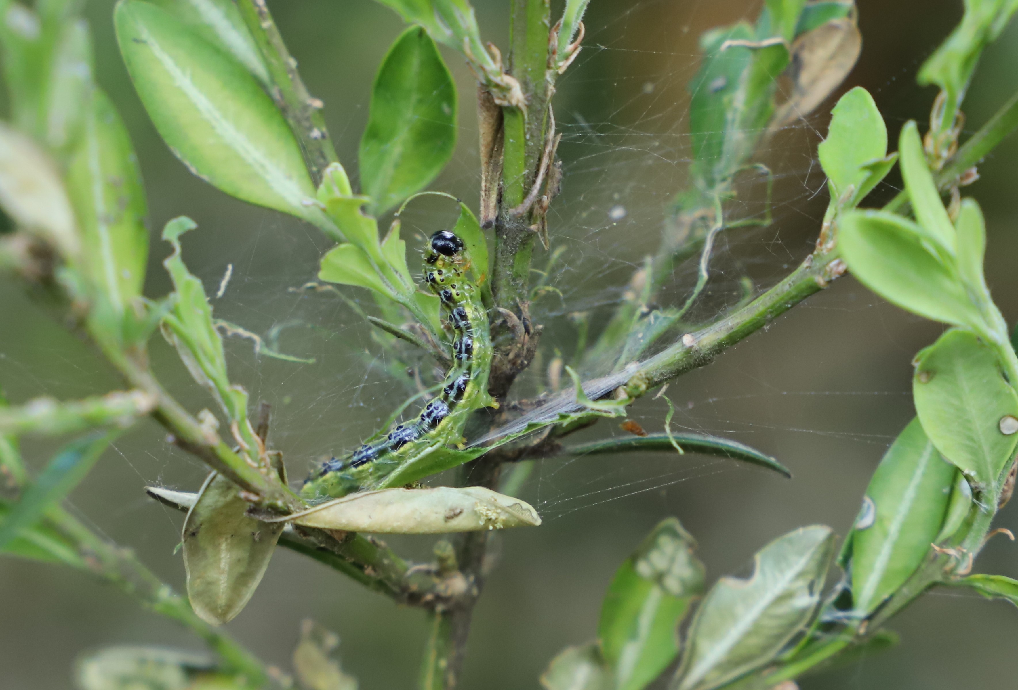 En cada una de estas generaciones pasa por 4 estadios larvarios muy diferenciados: mariposa, huevo, larva y crisálida. Durante el invierno permanece como larva juvenil, protegida entre 2 hojas de boj y recubierta por filamentos de seda.