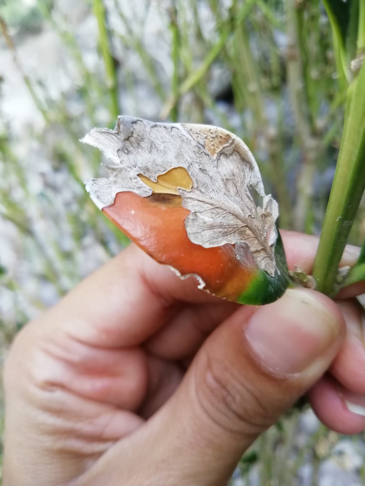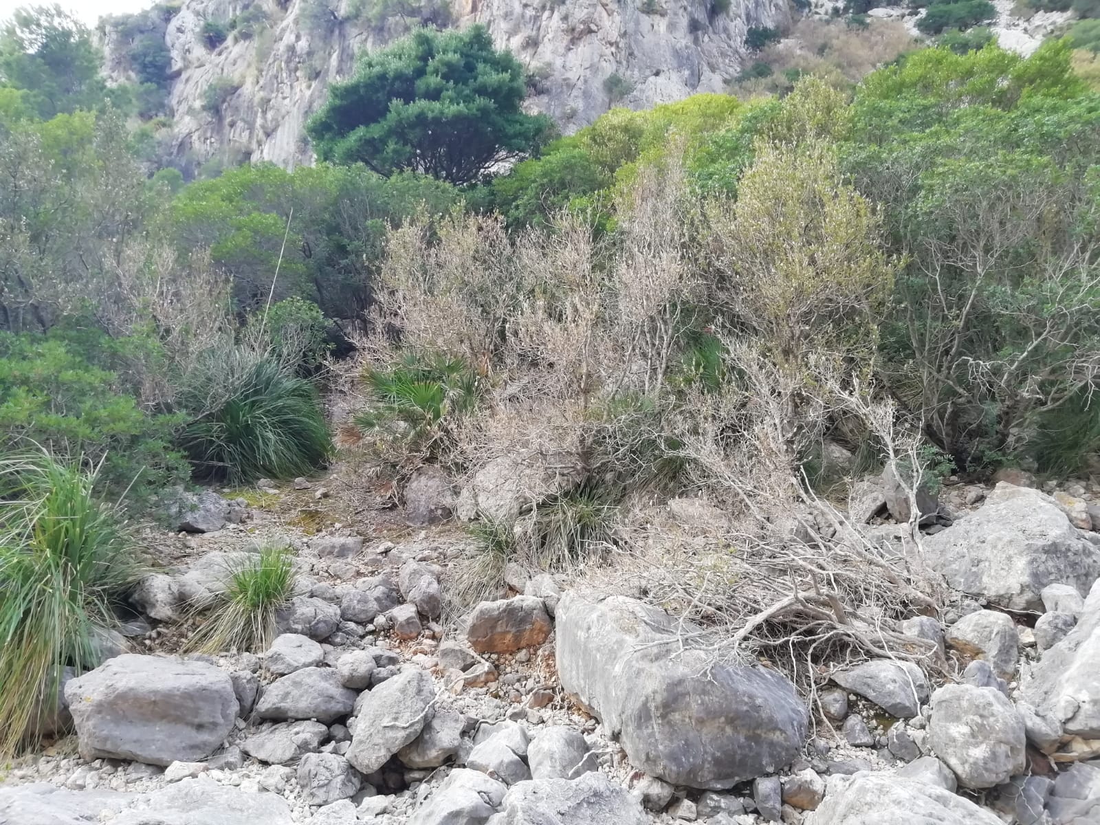 | Detalle hoja defoliadaFotografía: Sandra Closa | Bojedas afectadas en el torrente de Can Vela Gran, Pollensa.Fotografía: Sandra Closa |