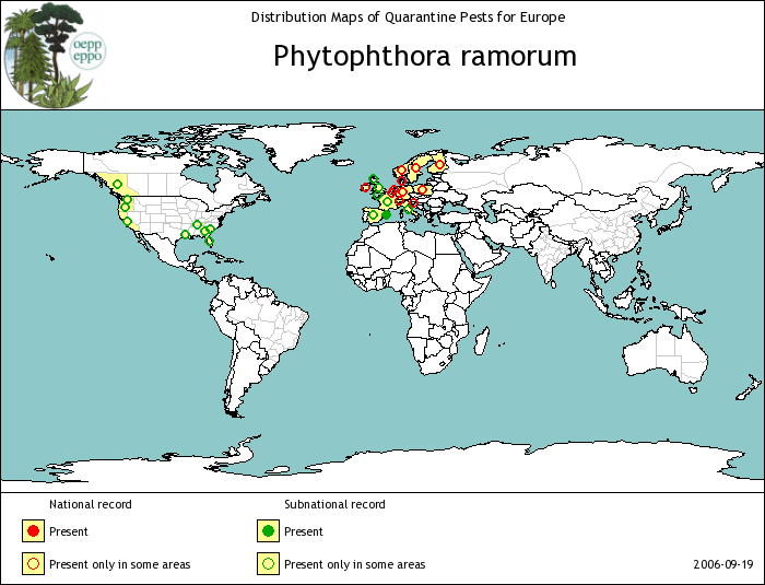 En países de Europa y Norteamérica. En España se detectó por primera vez precisamente en Mallorca, el año 2002, cuando científicos del IMEDEA lo encontraron en plantas de rododendro, en vivero. Más tarde se detectó también en Galicia, Badajoz, y Asturias. El mes de julio de 2021 se cierran los 4 brotes del País Basco, 3 de Galicia, 2 de Navarra y 1 en Cataluña; actualmente no hay ningún brote activo a nivel nacional (julio 2021).