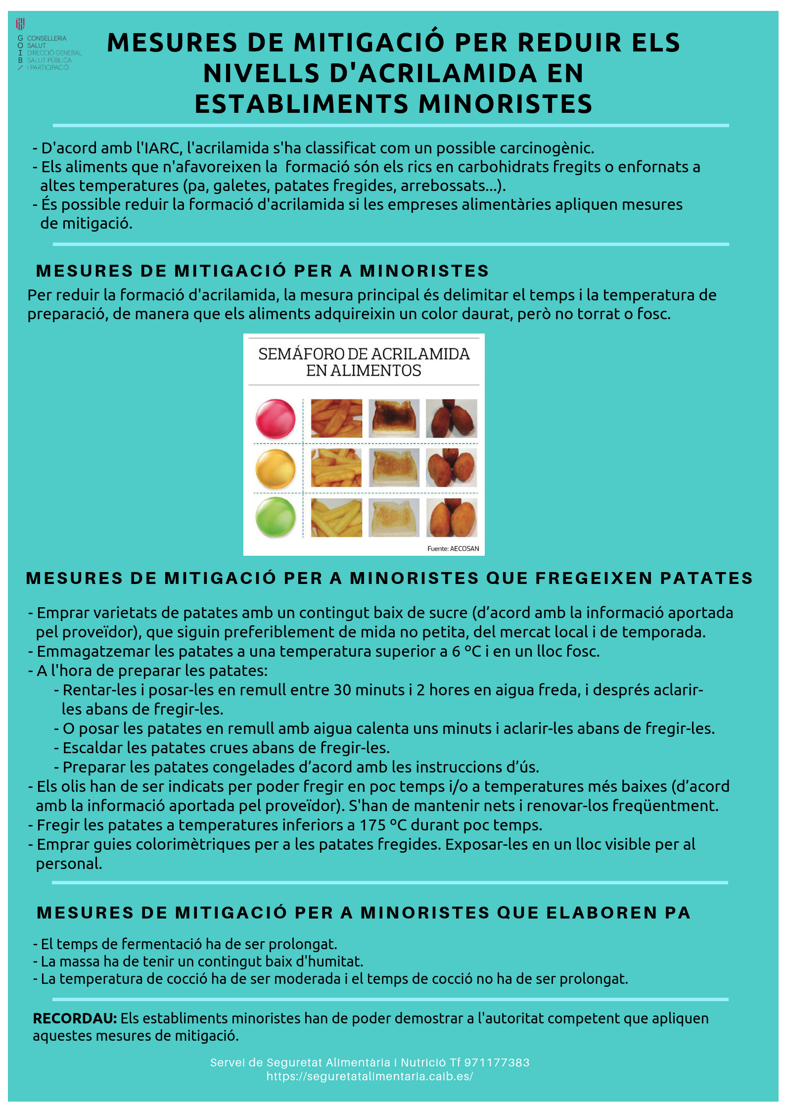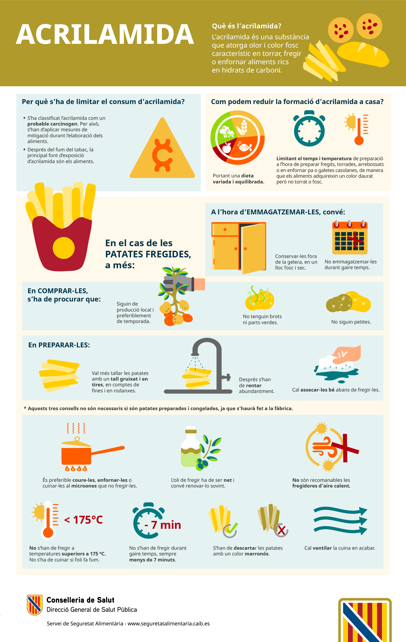 Reducció de l’exposició a l’acrilamida ¿Cóm reduir l’exposició a l’acrilamida? L’acrilamida és un compost que es forma en el cuinat de certs aliments sotmesos a elevades temperatures (més de 120ºC). Aquesta reacció química es la mateixa que “obscureix” aquests aliments i els fa més saborosos. Aquest procés es pot donar lloc a casa com a restaurants o en la indústria alimentària. Més informació