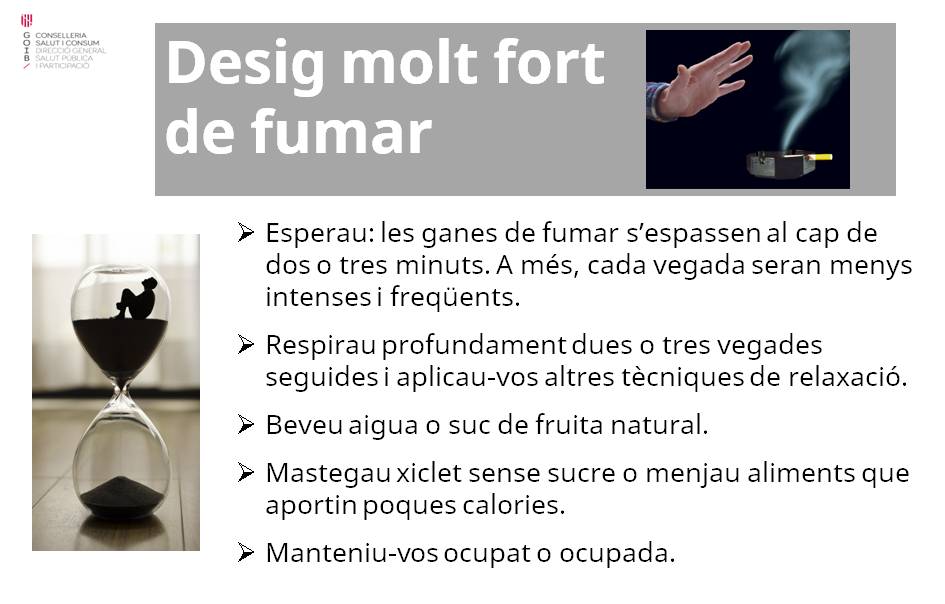 Aquí trobaràs una col·lecció de cartells amb les recomanacions per pal·liar la síndrome d’abstinència de la nicotina. Segons el fumador, de vegades se’n presenten uns o uns altres. Estar-ne previngut t’ajudarà.