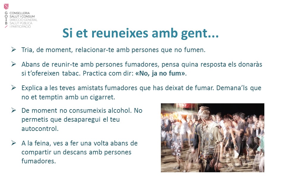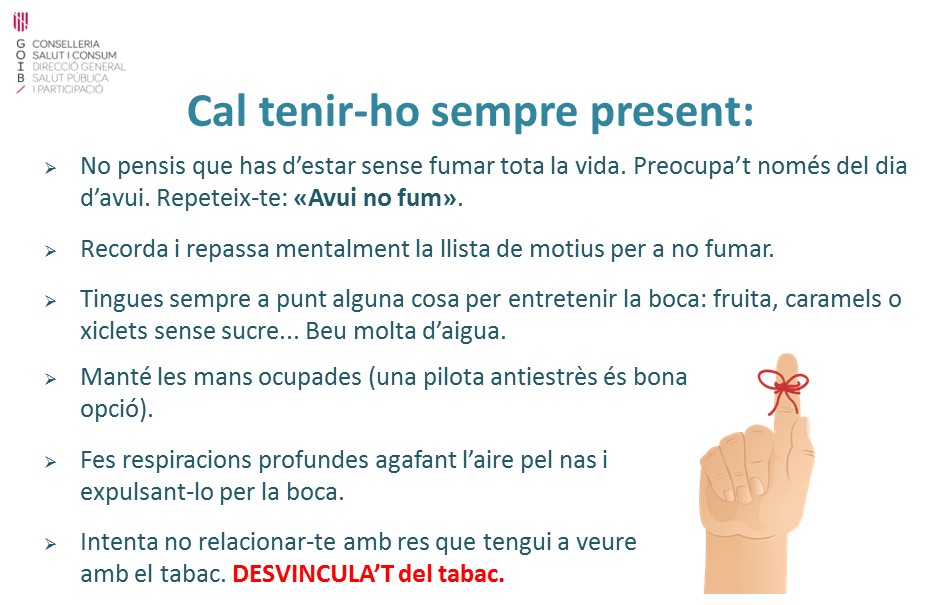 A partir d’ara, i durant un temps, és probable que tenguis moments difícils per mantenir-te sense fumar. Has de saber que aquests moments no duren sempre i que cada vegada seran menys freqüents i menys intensos.