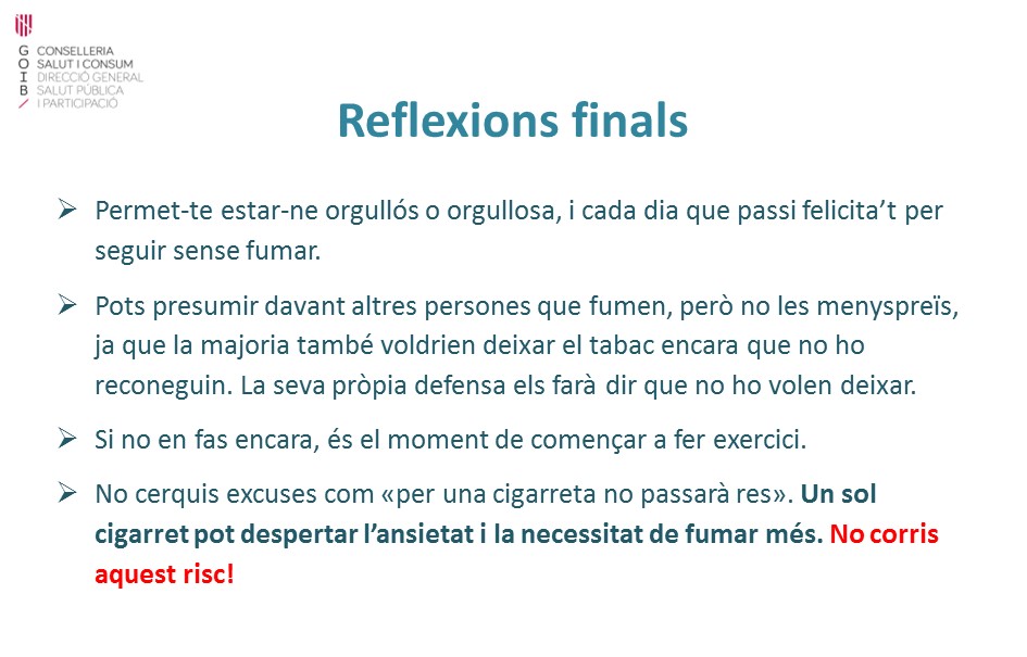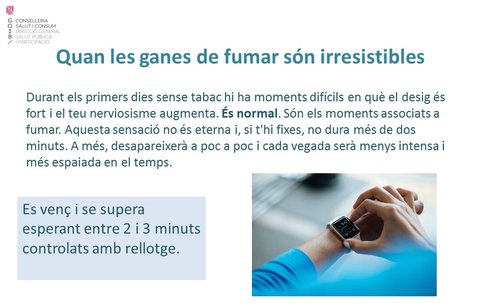 A partir d’ara, i durant un temps, és probable que tenguis moments difícils per mantenir-te sense fumar. Has de saber que aquests moments no duren sempre i que cada vegada seran menys freqüents i menys intensos.