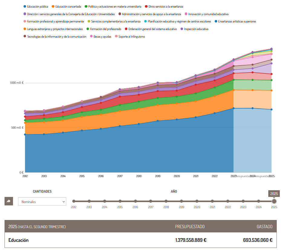 1. Entramos en https://pressupostsillesbalears.cat/es/politicas#view=functional y pinchamos en la política o servicio que nos interese. Por ejemplo, Educación:
