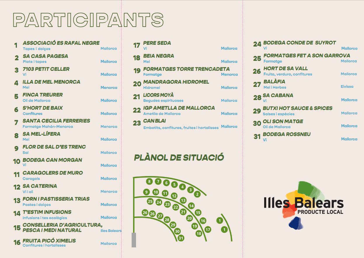 Entre los participantes se encuentran bodegas y productores de vino como Pere Seda, Bodega Rossneu, Sa Cabana, Sa Catarina, 7103 Petit Celler, Bodega Can Morgan y Bodega Conde de Suyrot; productores de aceite como Finca Treurer, Oli Son Matge y Sa Caterina; queserías como Formatges Fet a Son Garrova, Formatges Torre Trencadeta y Santa Cecília Ferreries (Queso Mahón-Menorca), y elaboradores de miel como Sa Mel·lífera, Beia Negra, Balàfia e Illa de Mel Menorca.