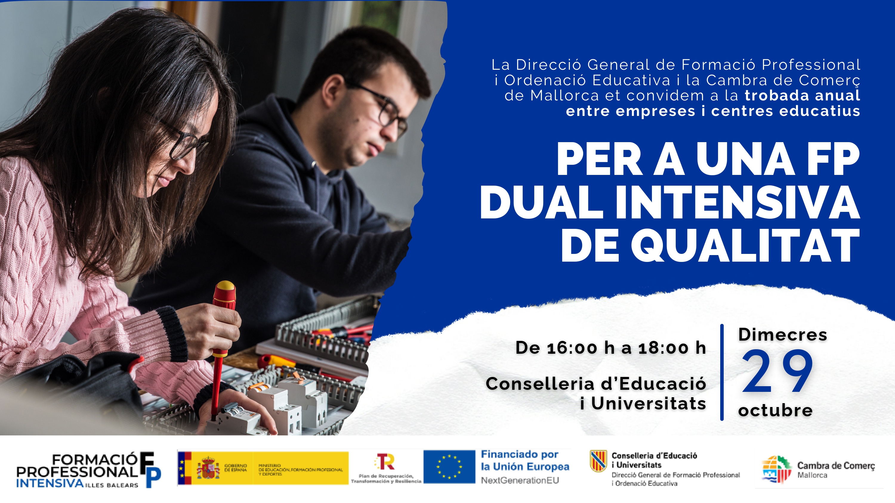 La Conselleria de Educación y Universidades acogió ayer miércoles, 29 de octubre, el encuentro anual entre empresas y centros educativos que participan en el programa de FP dual intensiva con contrato de formación, un modelo pionero impulsado hace doce años por la propia Conselleria y la Cámara de Comercio de Mallorca. Desde su creación, este proyecto ha crecido y se ha consolidado como un referente que ha permitido a cientos de alumnos formarse de manera práctica y a numerosas empresas incorporar talento cualificado.