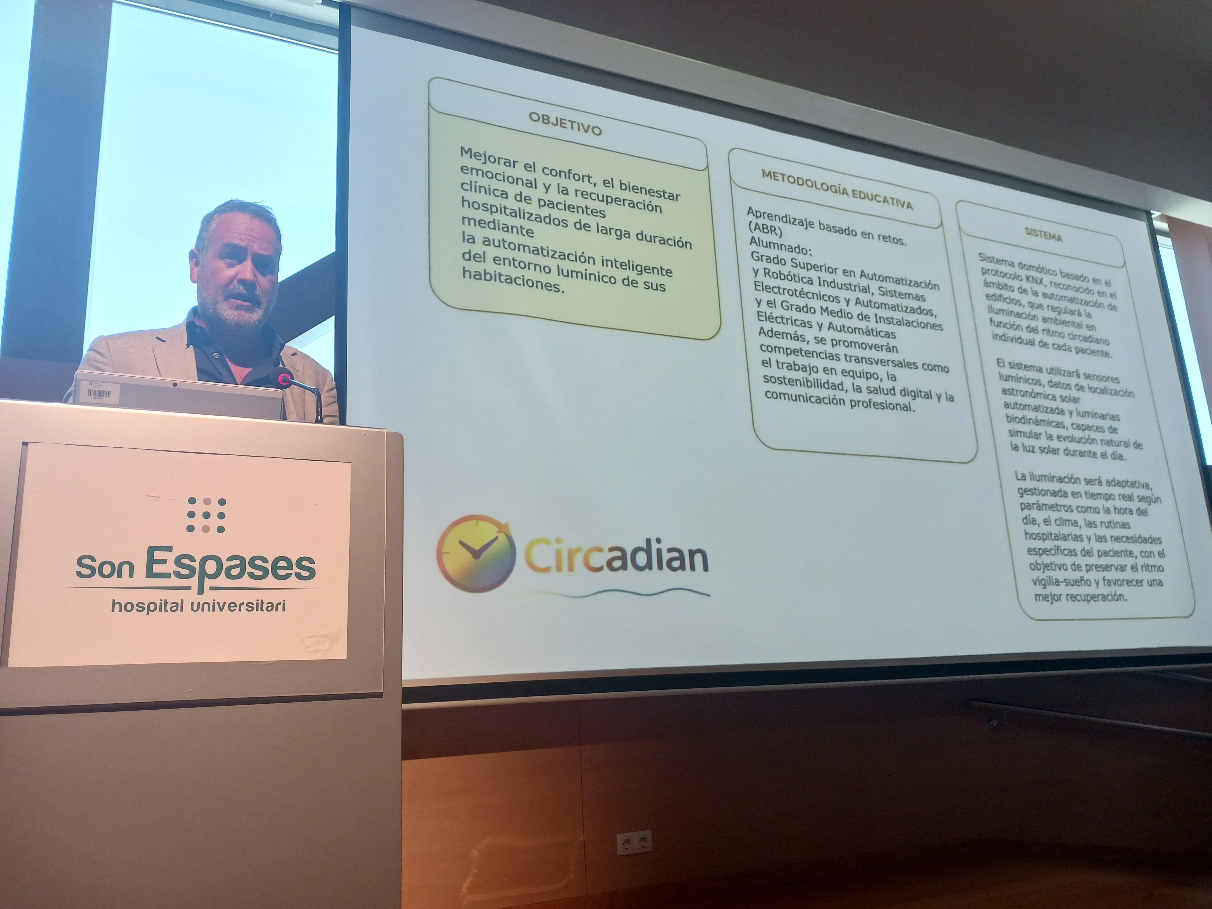 Por su parte, el proyecto “CIRCADIAN”, impulsado por el IES Politècnic, tenía como finalidad mejorar el confort, el bienestar emocional y la recuperación clínica de los pacientes hospitalizados de larga estancia mediante la automatización inteligente de la iluminación de sus habitaciones.